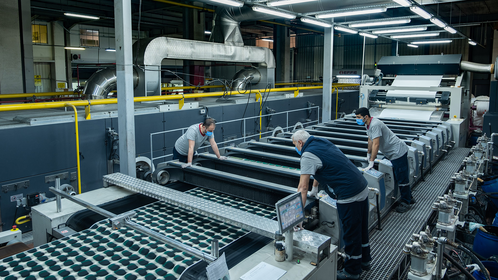 Sahip olduğumuz klasik multi pass dijital baskı makinelerimizin yanı sıra Türkiye’de ilk, dünyada ise sayılı olan en hızlı dijital baskı yöntemine sahip EFI/Reggiani Bolt single pass makinesini başarıyla parkurumuza ekledik. Böylelikle zamanla yarışan üretim gücümüz ile aylık kapasitemizi 3.000.000 metreye çıkartmış bulunuyoruz.