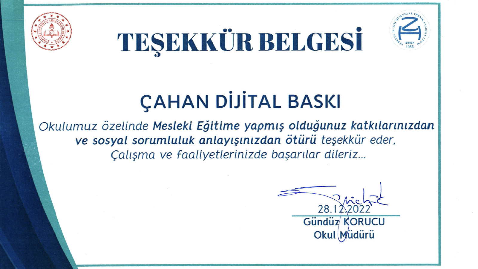 Zübeyde Hanım Meslek Lisesi Teşekkür Yazısı