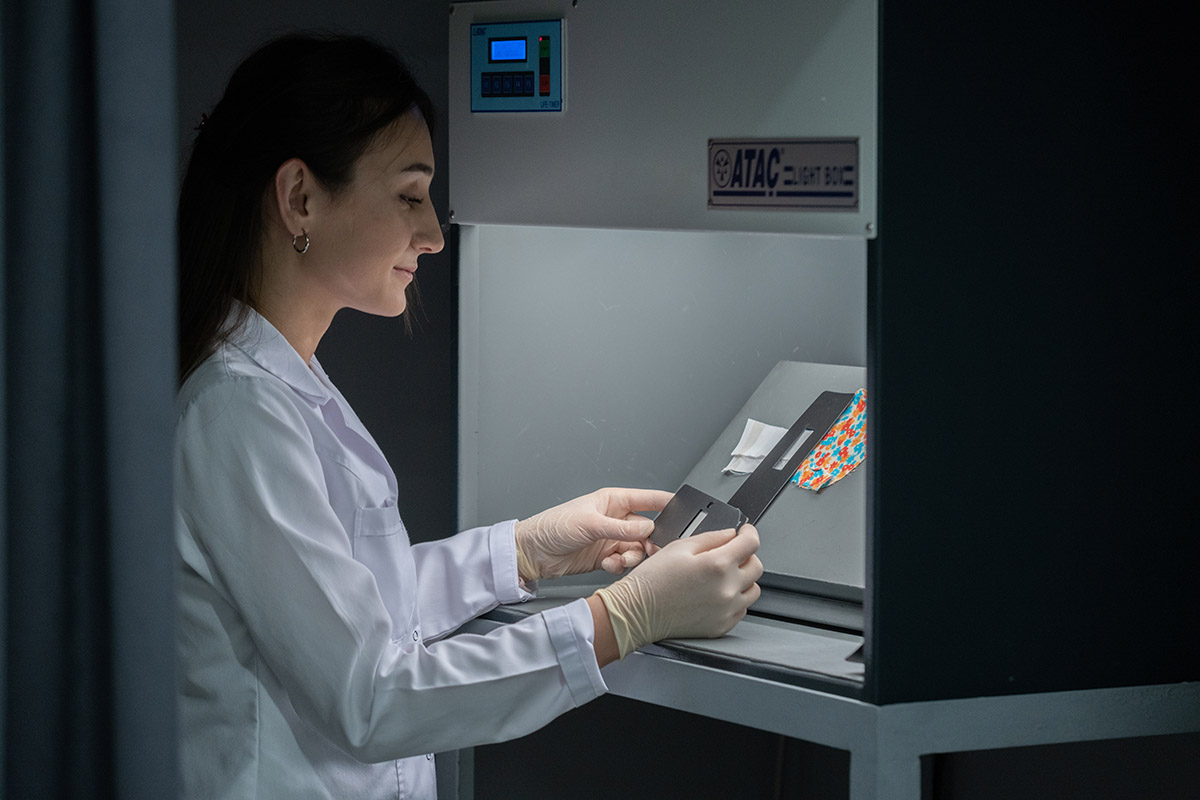 Laboratuvarımızda ürünlerimizin kimyasal ve fiziksel haslık testlerini yapıyoruz.